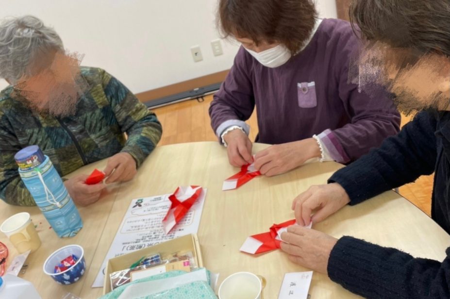 今回はハロウィンが近いこともあり、参加者様とほほえみーるスタッフで帽子とかぼちゃの折り紙や、リボンリースを作りました♫