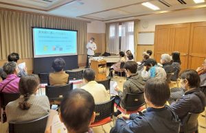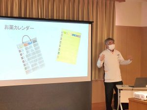 また、薬局の活用法としては、薬局を1つにまとめること、つまり「かかりつけ薬局」「かかりつけ薬剤師」を持つことの大切さをお話しました。さらに、認知症を心配されている方に対しては、発症する前からの人と関わりを持つことが重要であり、どんな些細な事でも薬局に気軽に相談して良い事などをお伝えさせていただきました。参加者の方からは多数の質問もありましたが、講義のお話を聞いて薬局に対する疑問を解消していただけたように思います。